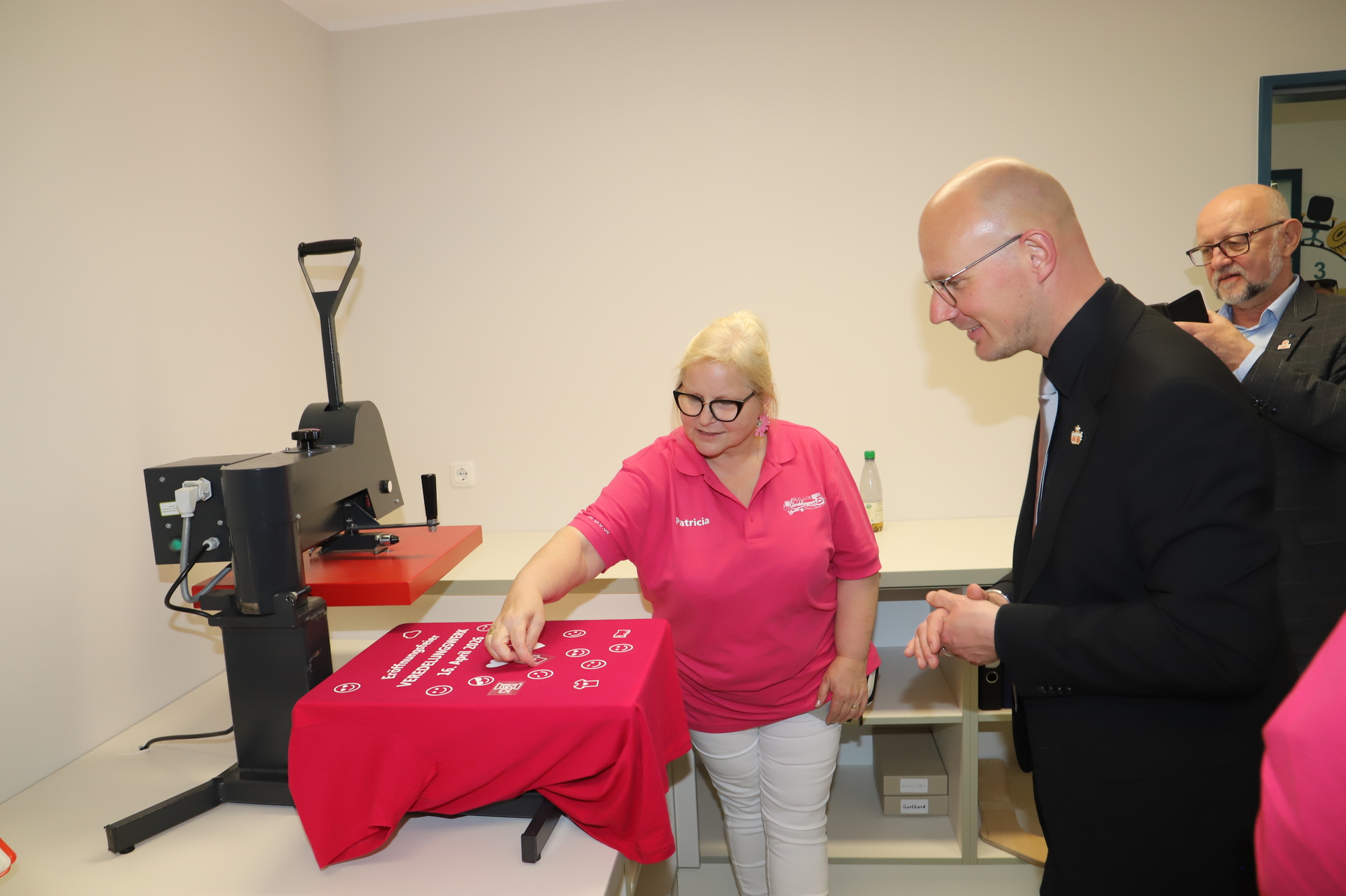 Oberbürgermeister Daniel Keip zeigte sich beeindruckt von dem Konzept und der Umsetzung. Er ließ es sich nicht nehmen, selbst aktiv zu werden und sein eigenes T-Shirt im Veredelungswerk zu bedrucken. Darüber hinaus erhielt er spannende Einblicke in den inklusiven Online-Buchhandel „Schmökerhöker“ und testete einen Alterssimulationsanzug sowie den Rollstuhlparcours.