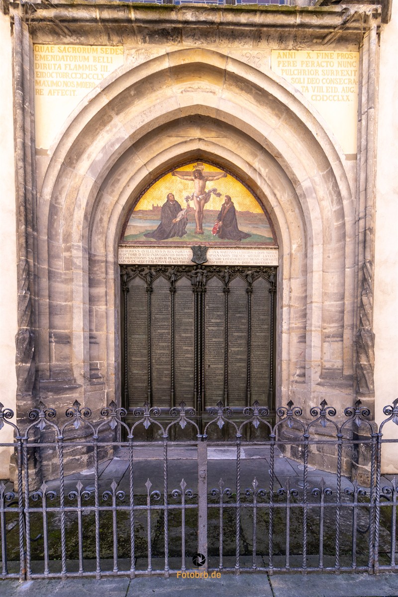 Der wohl berühmteste Ort in Wittenberg ist die Schlosskirche, deren Portal als symbolträchtiger Schauplatz der Reformation gilt. Am 31. Oktober 1517 soll Martin Luther hier seine 95 Thesen angeschlagen haben – ein Ereignis, das als Beginn der Reformation gilt. Auch wenn Historiker heute bezweifeln, dass der Thesenanschlag tatsächlich so stattgefunden hat, ist das Bild fest in der kollektiven Erinnerung verankert.